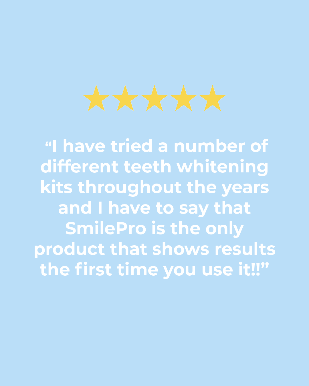Nachdem ich ein wenig im Internet recherchiert habe, bin ich auf SmilePro gestoßen und wollte es unbedingt ausprobieren. Ich kann nur sagen und jedem empfehlen sie zu probieren. Nach etwa 5-6 maliger Benutzung, sah man ein deutlicher Unterschied, als vor der Benutzung. Dazu, keine sensiblen Zähne und keine Schmerzen nach der Benutzung. Und natürlich die Freude, auf schöne weiße Zähne.